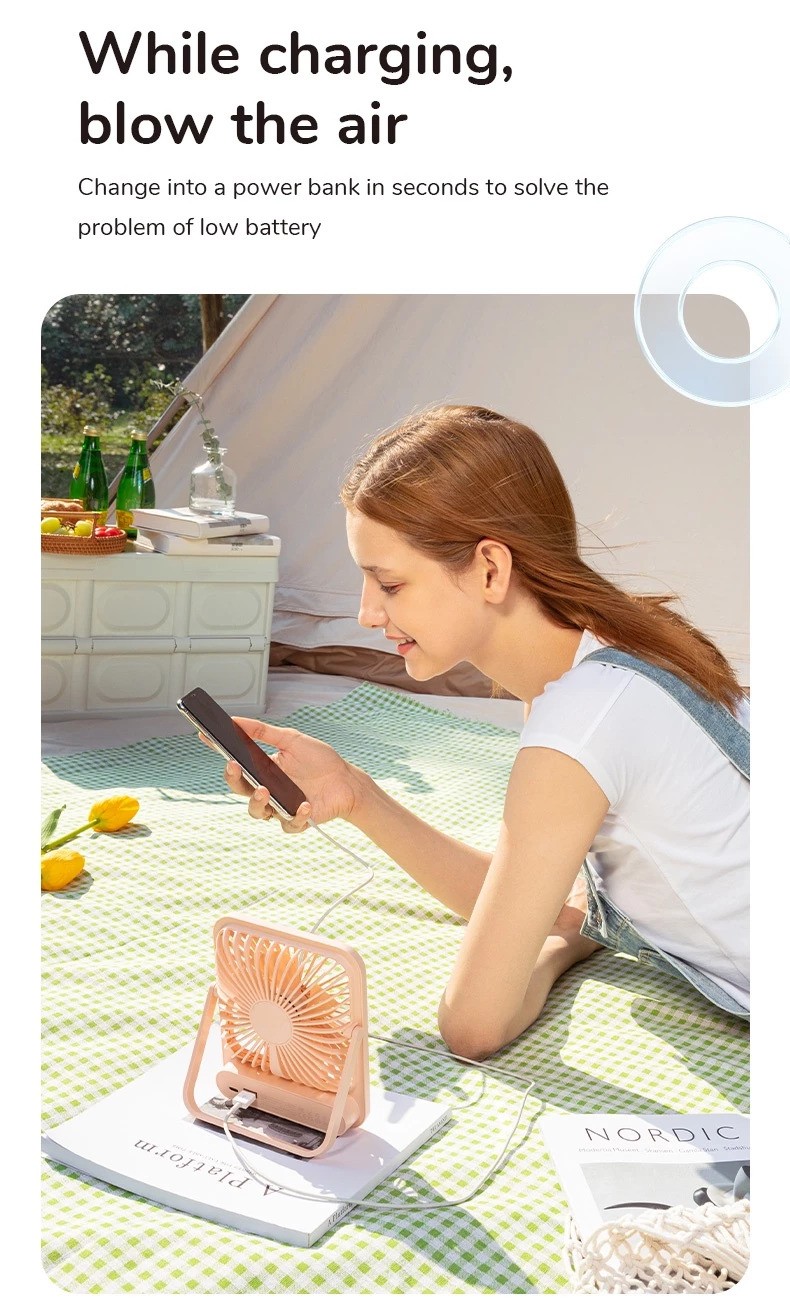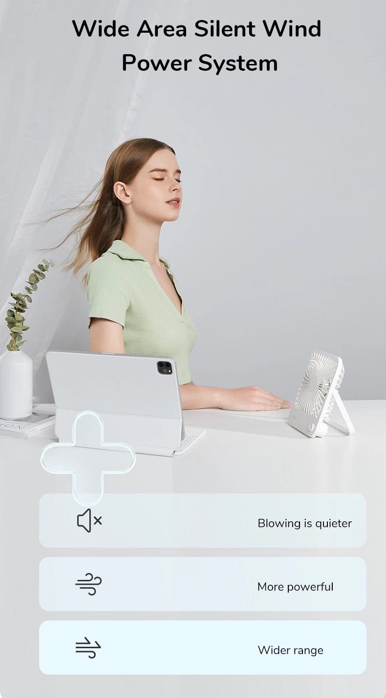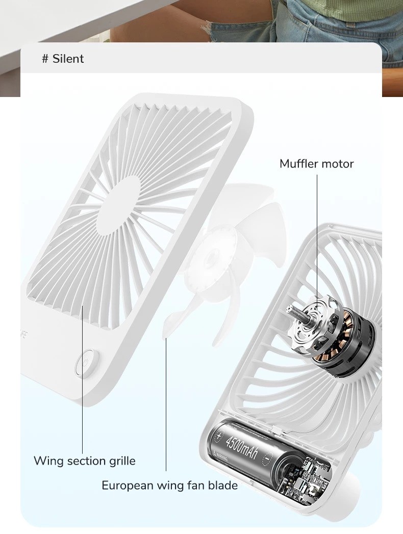 Cordless and Rechargeable:This desktop fan has a built-in 4500 mAh energy-saving battery, which is not anxious for going out. And it is equipped with a USB interface, can be used as a power bank in an emergency as well.