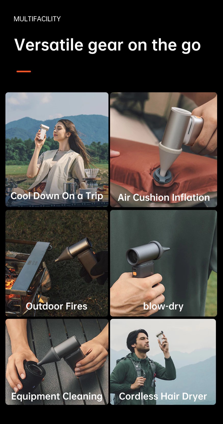 Multifunctional Equipment On the Go Travel, as fan, as Hair dryer, blower