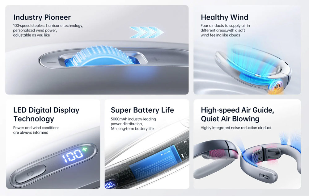 100 Speeds Wind -Twin turbo brushless motor brings strong wind power, neck fans for men can be adjusted at 1-100 speed by an infinitely adjustable knob, instant cooling, in any case, can provide the best cooling effect. In the hot summer, it is enough.